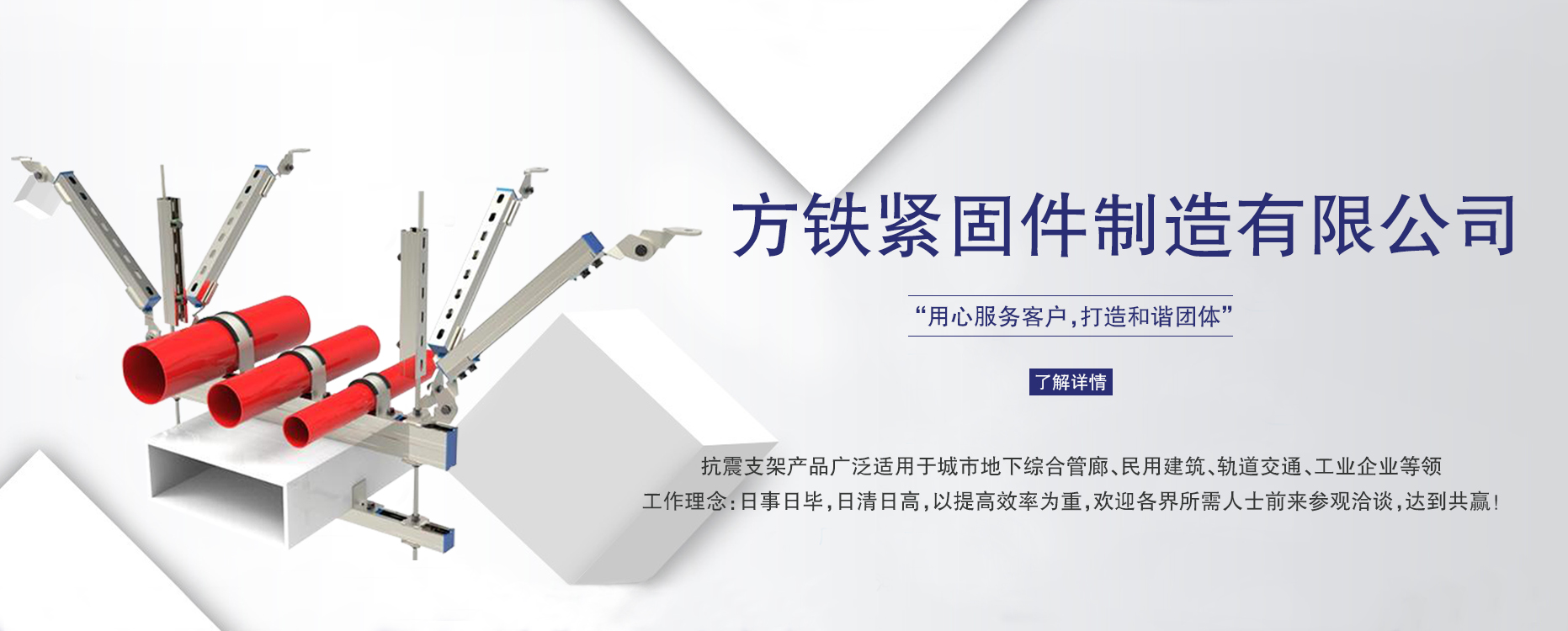 邯鄲市方鐵緊固件制造有限公司位于邯鄲市永年工業園區,系一家從事建筑機電工程抗震支撐系統、成品裝配式支吊架系統、城市綜合管廊預埋槽道系統的研發、設計、生產和銷售的綜合性企業 ,并提供深化設計、技術指導及施工安裝等周到服務。 公司秉承“用心服務客戶,打造和諧團體”的經營理念,憑借多年實操經驗,深化 方案、擁有完整的配套產品,愿為中國民生工程做出更多貢獻。 我公司運營的抗震支架產品廣泛適用于城市地下綜合管廊、民用建筑、軌道交通、工業企業等領 。我們員工工作理念:日事日畢,日清日高,以提率為重,歡迎各界所需人士前來參觀洽談,達到共贏!